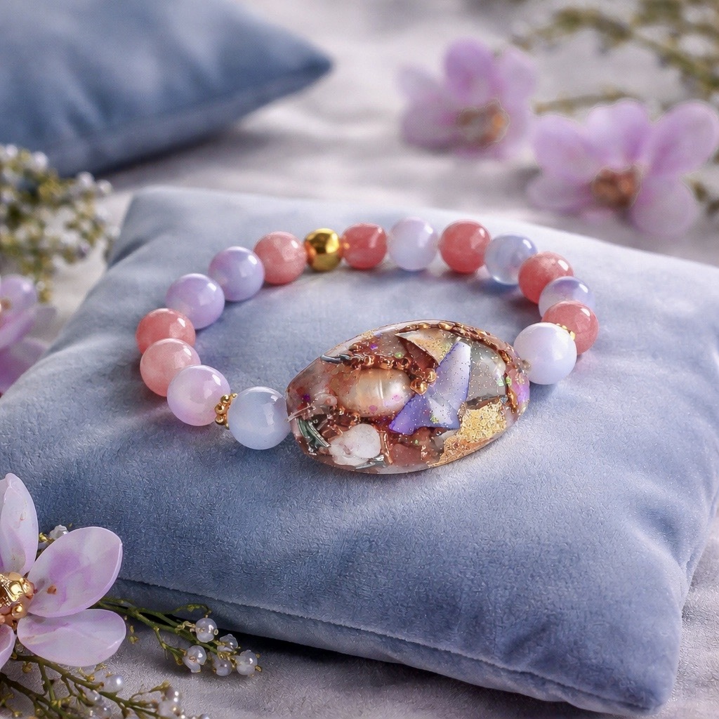 Nous avons aussi associé dans notre collection d’orgonite « Rosée » le quartz cerise à la calcédoine bleue, ce qui fait un mariage excellent pour renforcer davantage encore les propriétés de ces deux pierres.