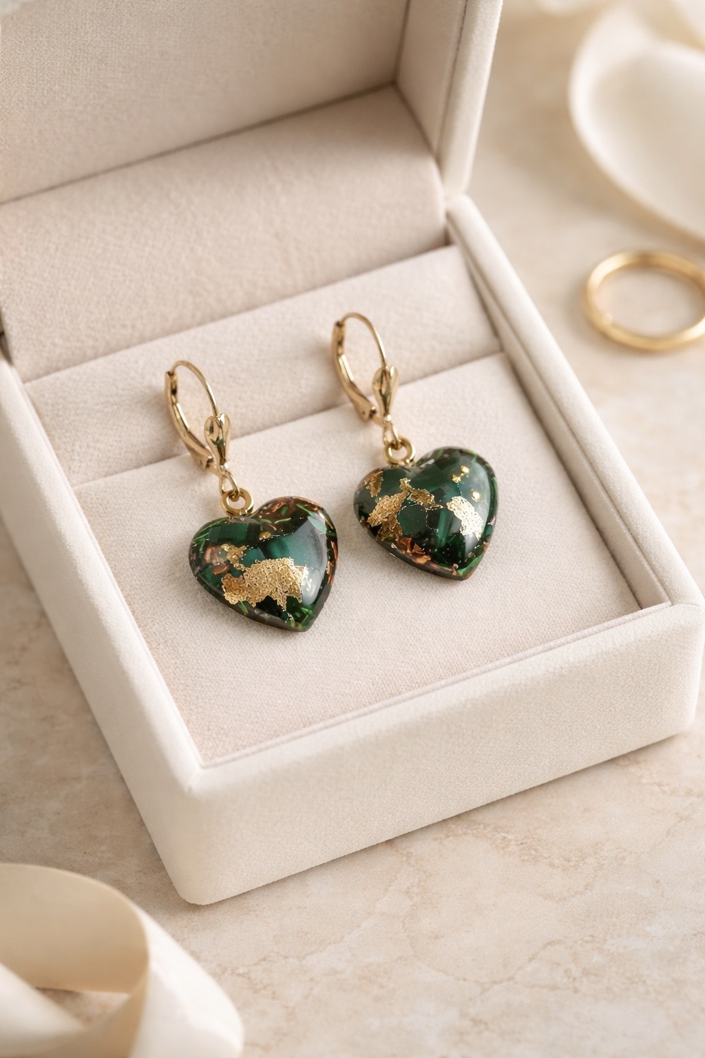 Je vous propose ces jolies petites boucles d’oreilles orgonite coeur avec malachite, aux vertus puissantes. On utilise la malachite depuis des siècles pour réduire l’anxiété et la nervosité, tout en favorisant l’estime de soi. Elle permet en quelque sorte la guérison émotionnelle en nous libérant de nos blocages, et en favorisant chez nous un discours clair. Elle dissout les énergies négatives sur tous les plans de l’être.