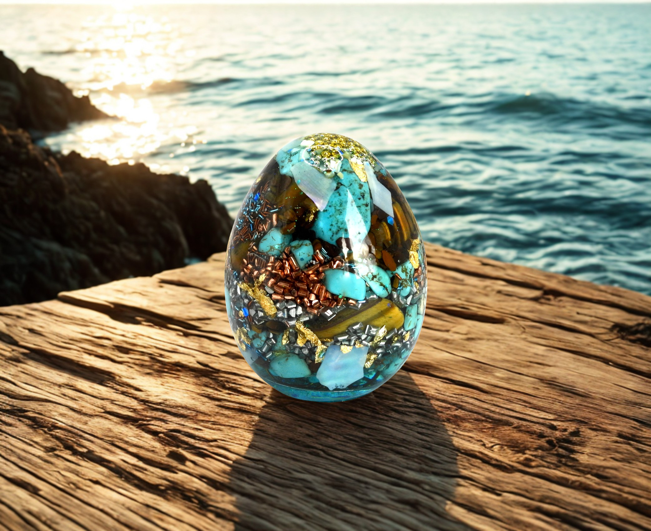 C’est un oeuf orgonite de toute beauté, aux couleurs bienfaisantes de l’Océan, avec inclusions de turquoises, oeil de tigre, perles d’eau et nacres : cette merveilleuse composition génère une énergie très joyeuse et optimiste, qui aide à chasser les pensées maussades et négatives tout en nous protégeant des pollutions électromagnétiques de l’époque actuelle. Fabriquée à la main dans notre atelier normand, cette orgonite convient à une surface de 100 m2, vous la centrerez approximativement par rapport à l’ensemble de votre habitation afin qu’elle rayonne partout de façon harmonieuse.