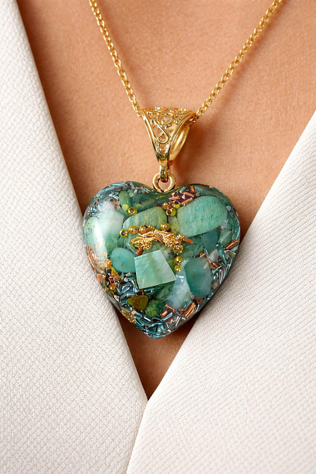 Ce joli coeur orgonite/amazonite apporte une sérénité et une douceur qui conviennentt parfaitement aux personnes angoissées. Il éloigne les pensées et influences négatives et nous apprend à être positifs.