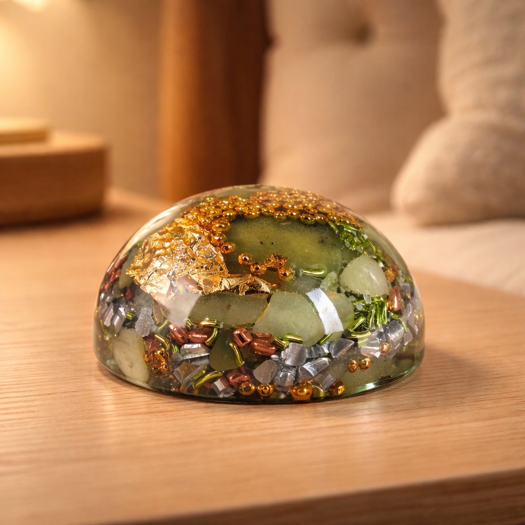 Merveilleux objet ! Cette orgonite jade en forme de demi-sphère permet de retrouver la sérénité lorsque tout va mal, elle est réputée pour apporter des solutions aux conflits. Elle symbolise le calme, la longévité, la sagesse et l’honnêteté. En Chine, le jade est hautement considéré et travaillé depuis toujours, et il est considérée comme la pierre possédant toutes les vertus.