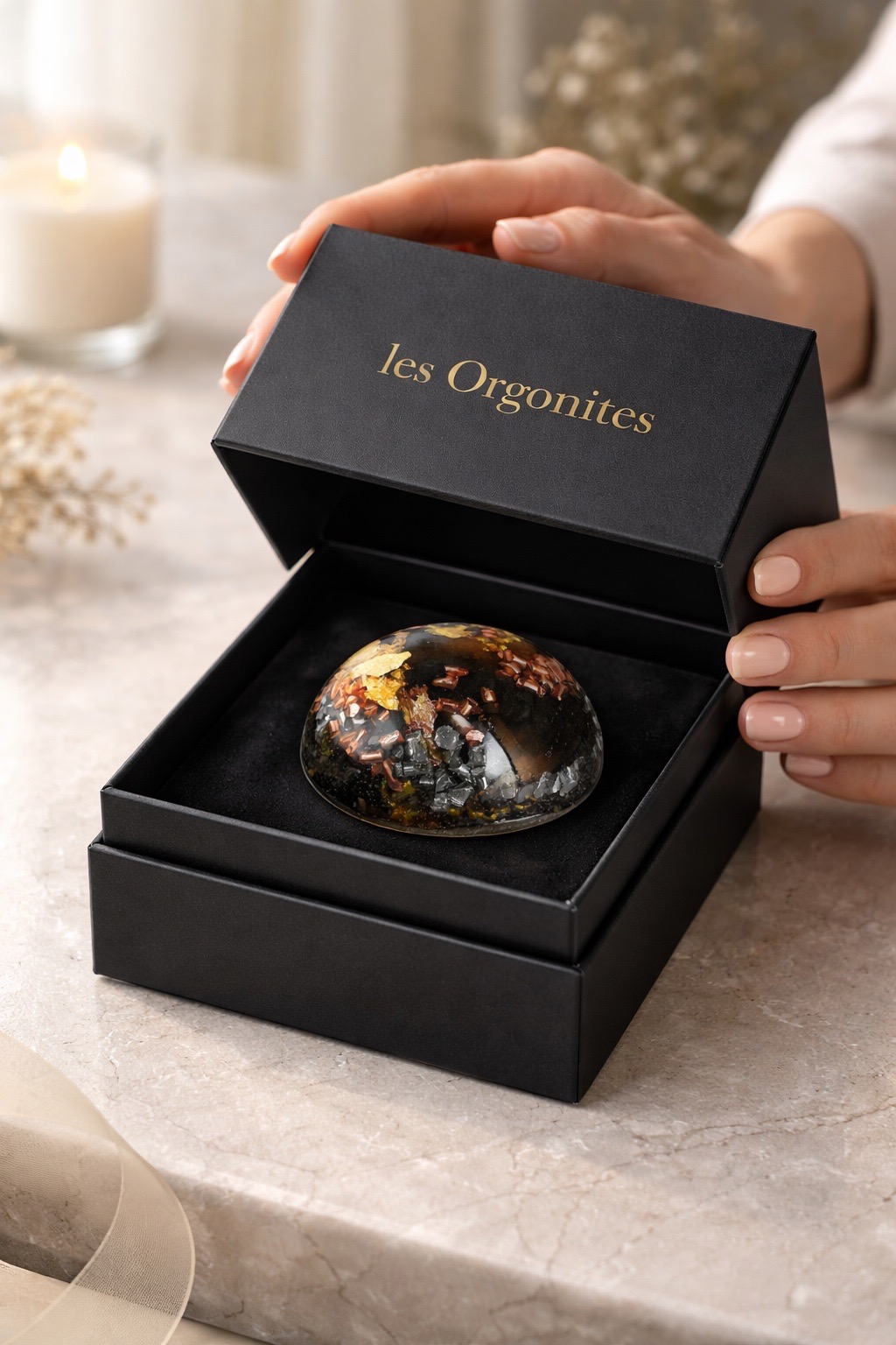 L’orgonite shungite est très complète. Elle est composée de pierres de shungite, d’un cristal de roche entouré d’un fil de cuivre, de feuille d’or 14 carats et des métaux nécessaires à son fonctionnement. Par sa taille (5 cm de diamètre) elle est très pratique à utiliser : on peut la garder sur soi, en poche, dans un sac pour se rendre à l’extérieur, on la place sur un bureau ou dans la chambre. Les propriétés de la shungite ont fait l’objet d’études sérieuses qui lui ont valu la reconnaissance par trois prix Nobel, sur la purification de l’eau et les ondes électromagnétiques. On dit aussi de la shungite qu’elle est très efficace pour se protéger des ondes négatives émanant des personnes, et aussi pour éloigner les entités.