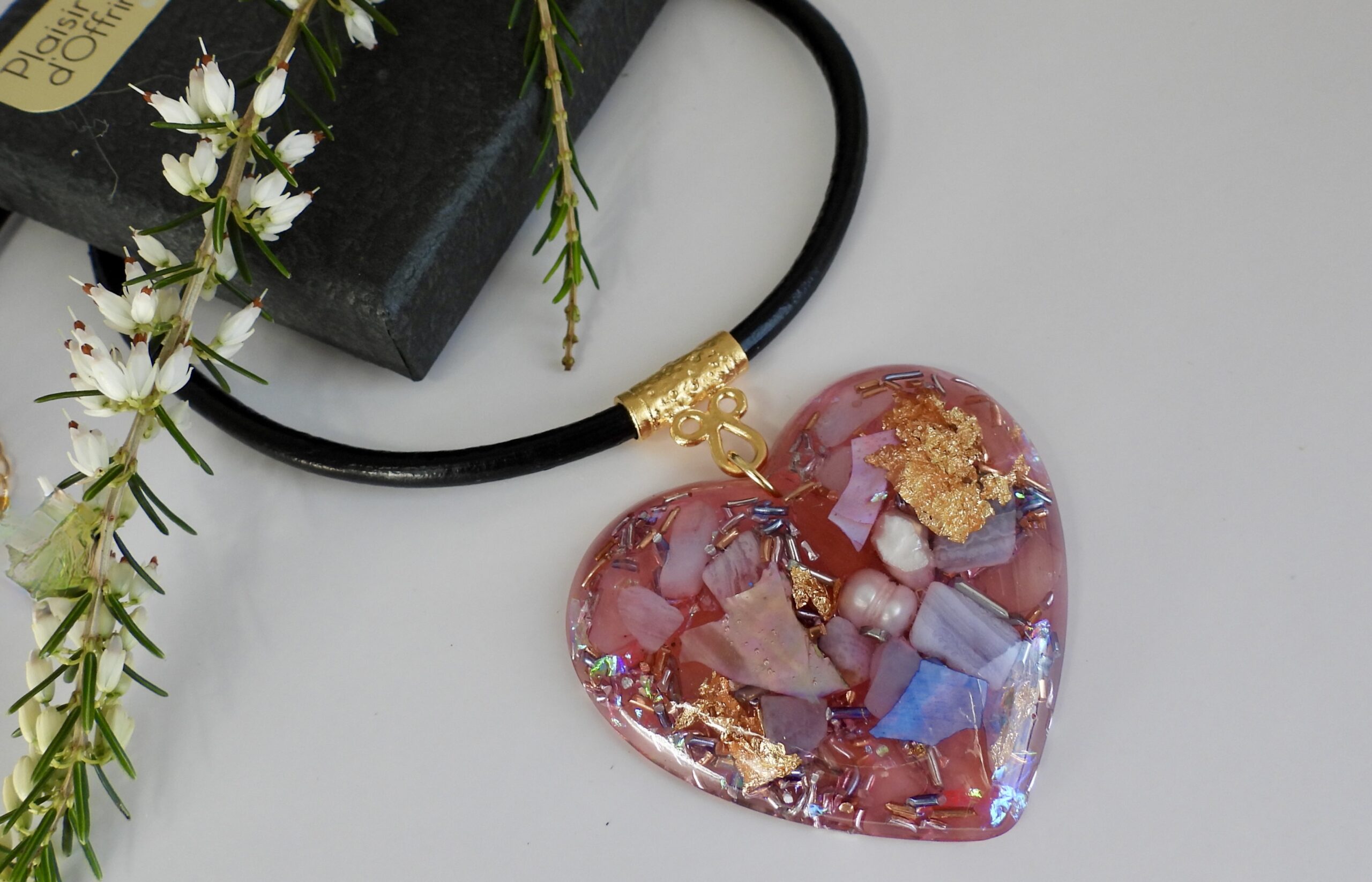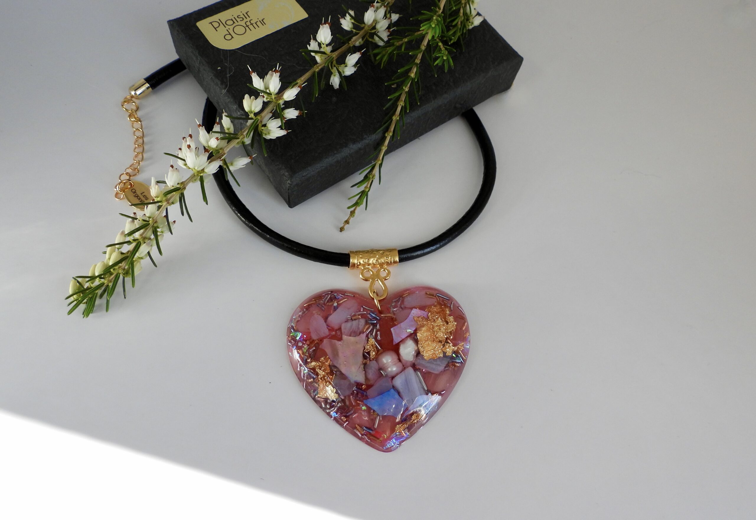 J’ai monté ce pendentif sur un cordon en cuir noir de très belle qualité de 45 cm environ extensible par chaînette de cou jusqu’à 50 cm environ.