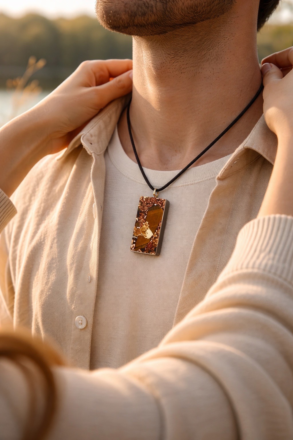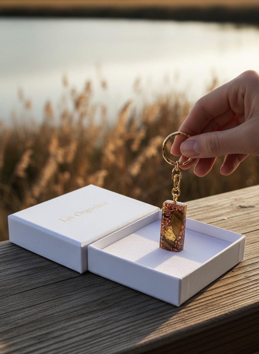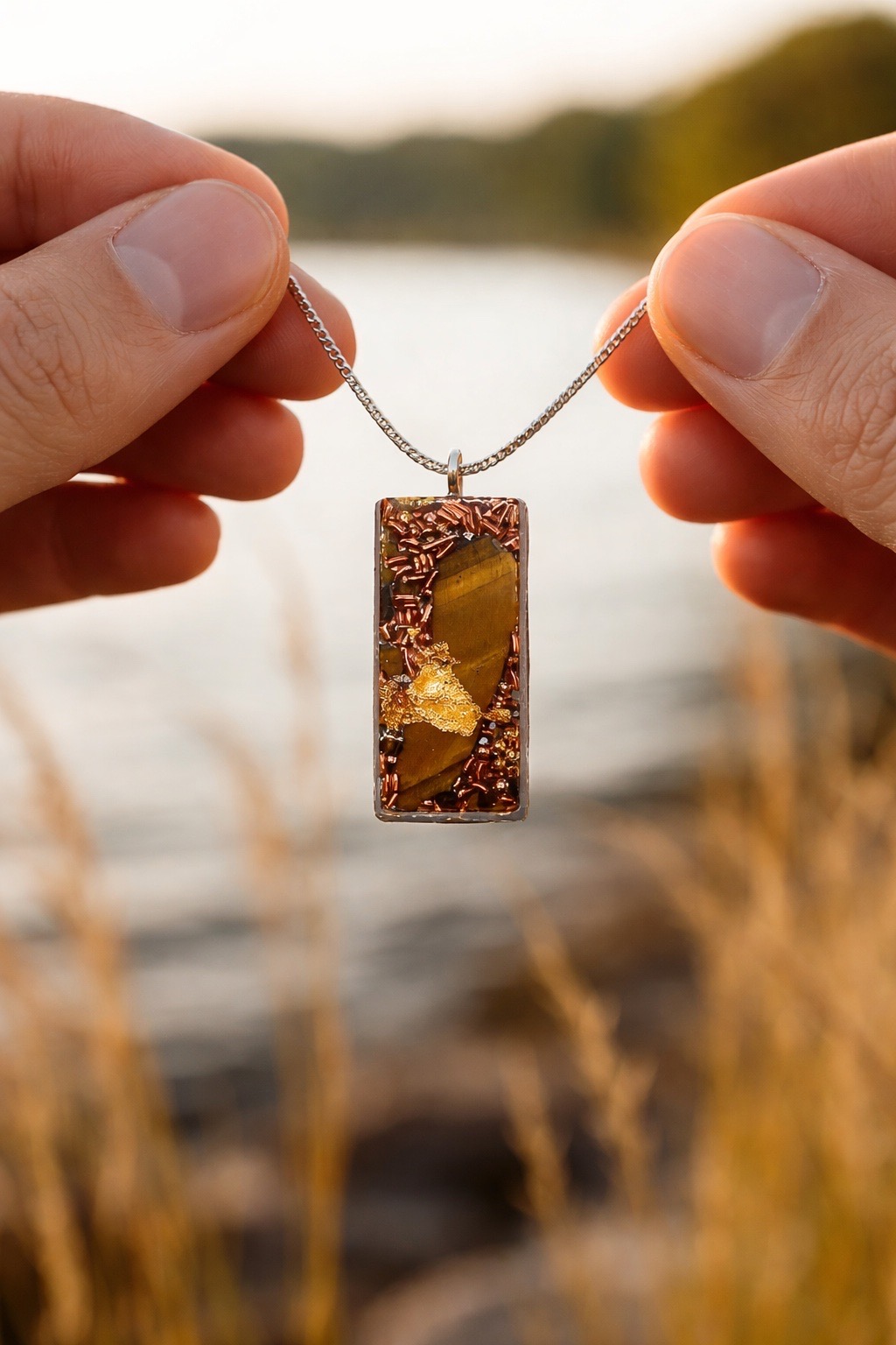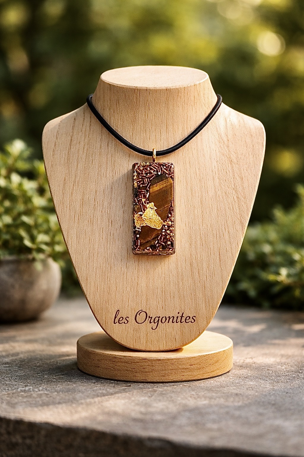 Magnifique pendentif orgonite avec inclusion d’oeil de tigre, cristal de roche, feuille d’or et différents métaux – pratique pour bénéficier de l’orgonite au quotidien ainsi que des vertus de l’oeil de tigre :. celui ci  a la réputation de repousser le mauvais oeil, dans l’orgonite ses vertus sont amplifiées.